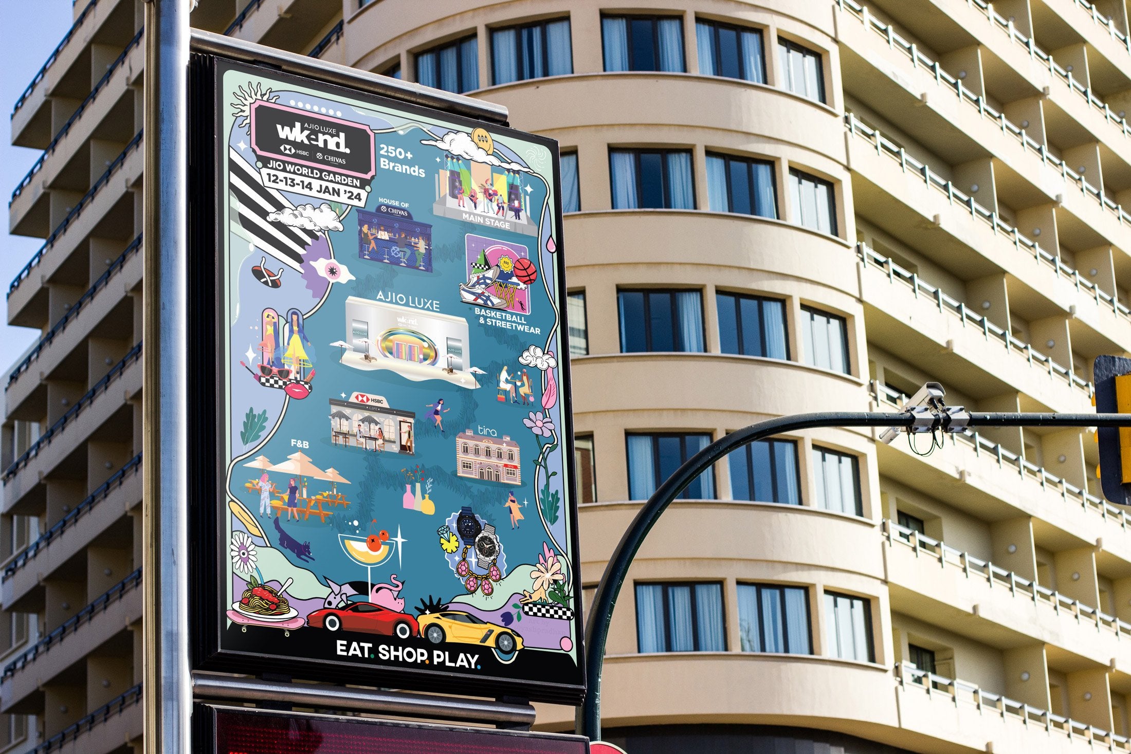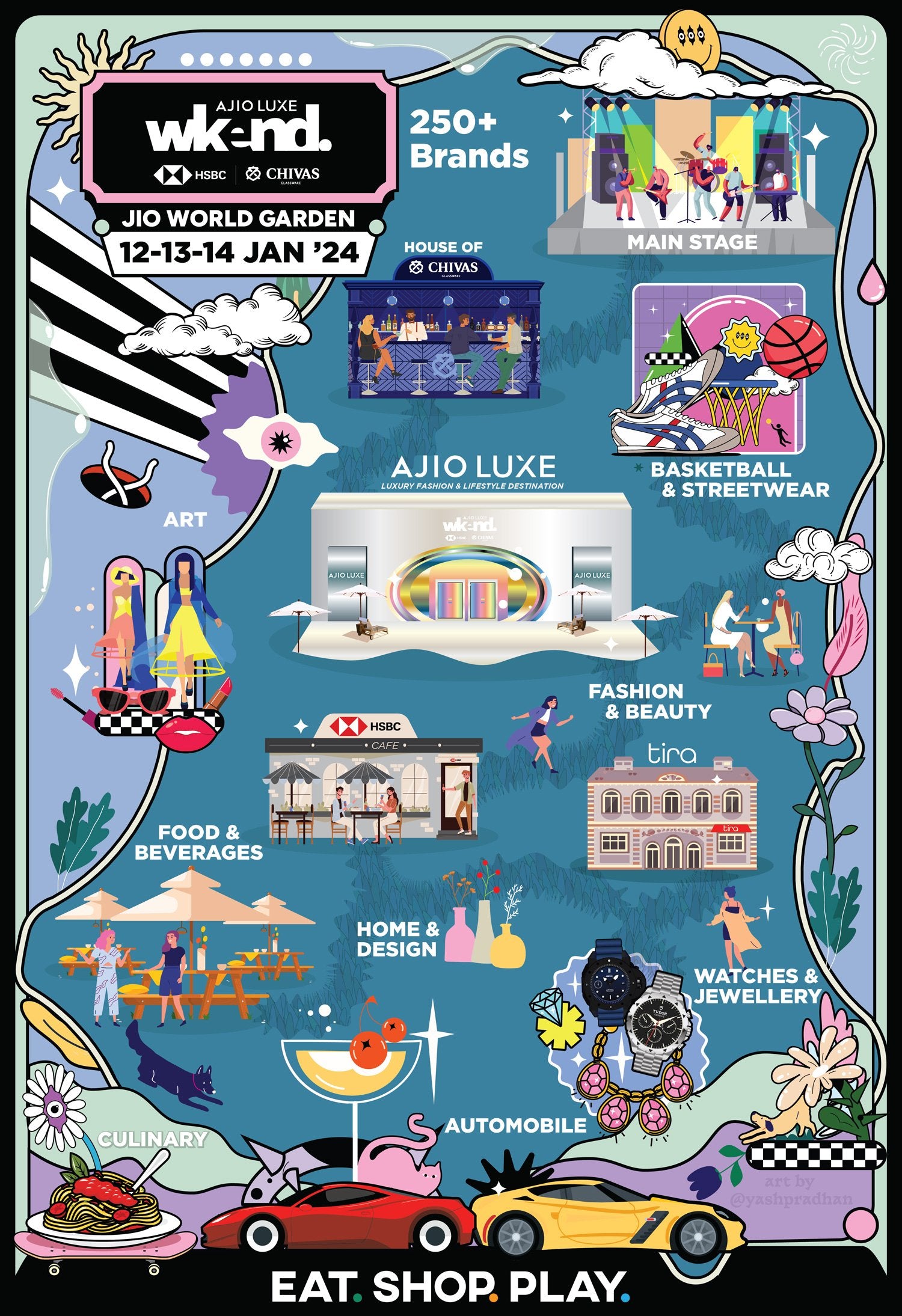 The featured artwork was not merely a visual treat but served as a comprehensive guide to the extravagant event. Yash Pradhan's composition skillfully mapped out the venue, providing a preview of what attendees could anticipate during the Ajio Luxe Weekend. The intricate design showcased key highlights such as the Ajio Luxe Lounge, House of Chivas, HSBC Cafe, Tira Mansion, Main Stage, F&B area, and a dedicated space for Basketball and Streetwear enthusiasts.
