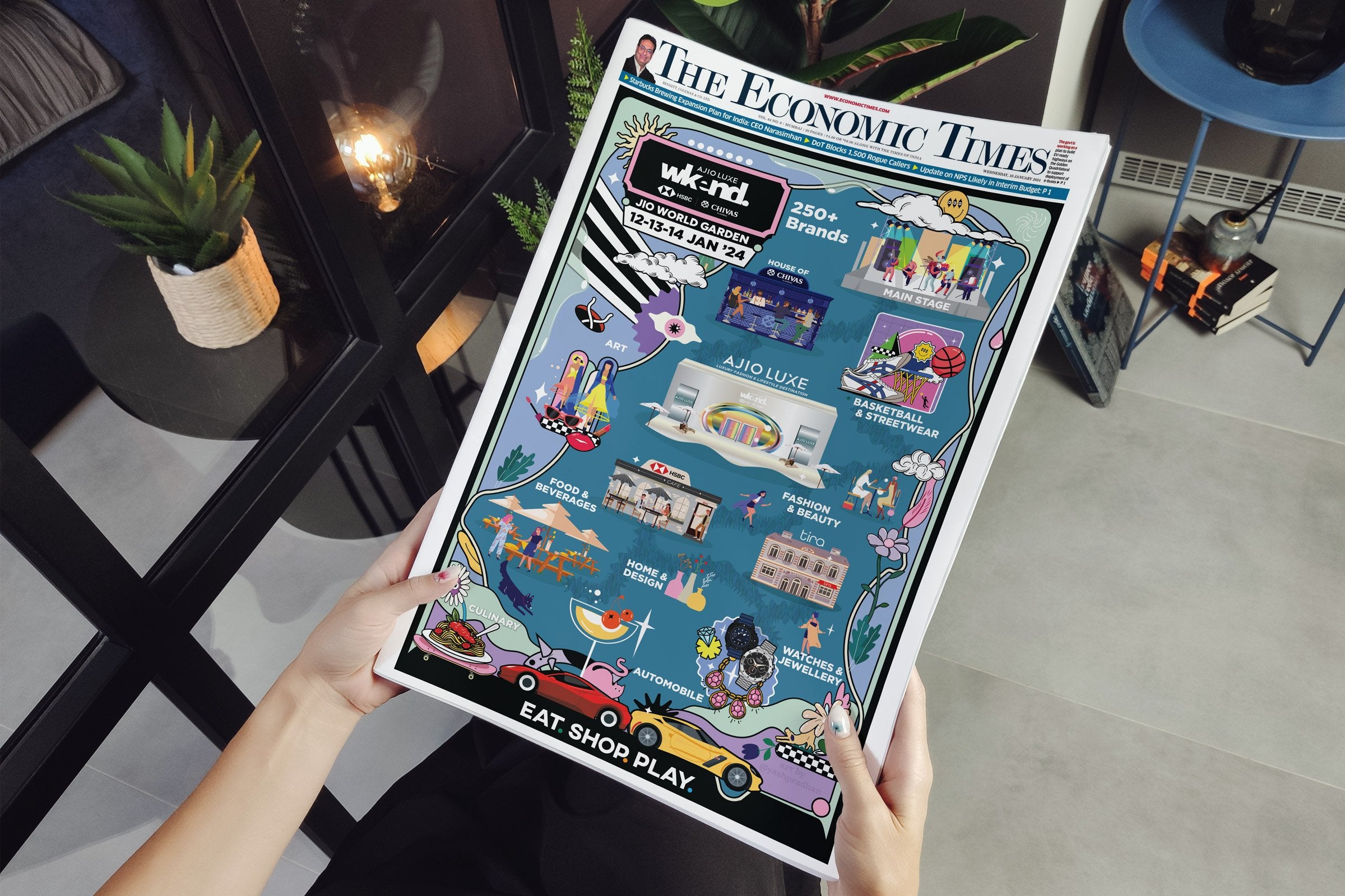 Placing this artwork on the front page of The Economic Times added a touch of sophistication and exclusivity, making a bold statement about the significance of Ajio Luxe Weekend in the realms of art, design, and luxury. It not only served as an invitation but also as a collector's item, encapsulating the essence of the event and the collaborative spirit between Ajio Luxe Weekend and Yash Pradhan.
