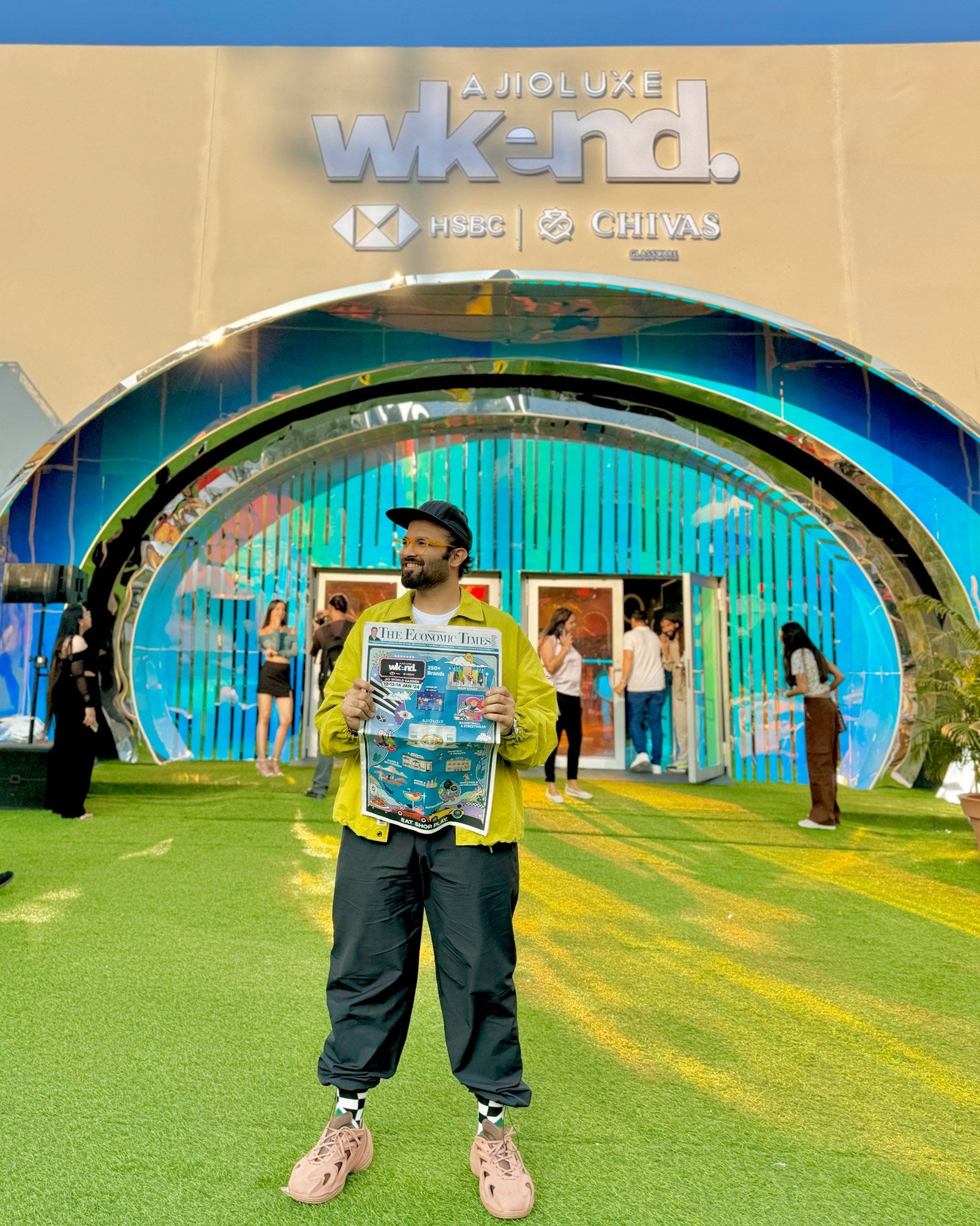 Here’s Yash Pradhan holding his artwork on front page of The Economic Times at Ajio Luxe Wkend 2024, Jio Garden, BKC, Mumbai.