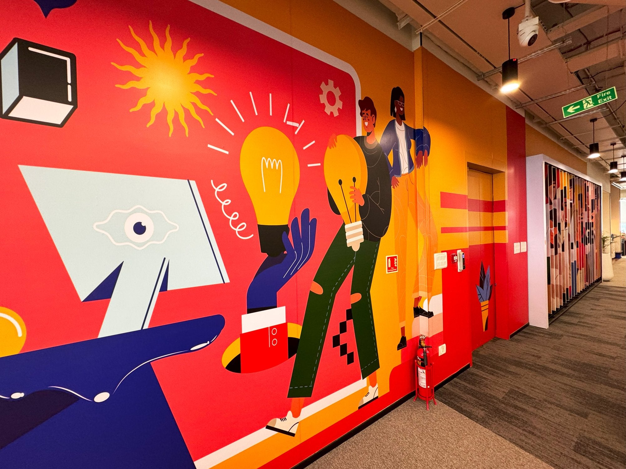 Designing the wall artworks for Havas Village, the innovative office space of Havas India, involved creating a vibrant and inspiring environment that mirrors the company's dynamic spirit. Each artwork is thoughtfully integrated into various areas, including the workspace, cafeteria, round pillars, lobby area, and a unique rotating lenticular wall.