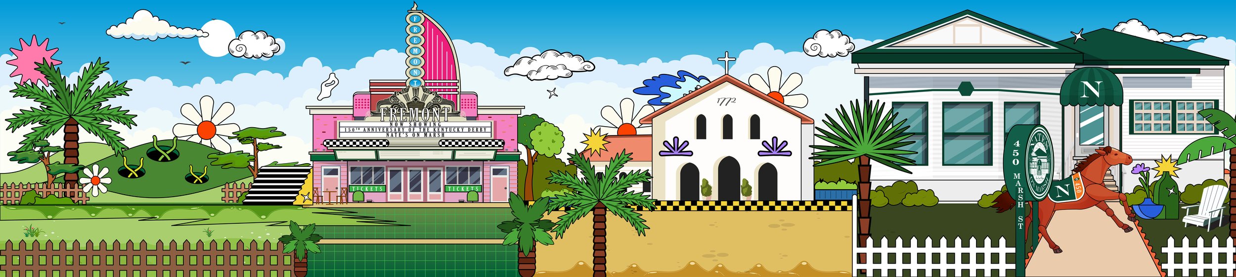 This piece captures the essence of the area, incorporating iconic elements such as the Fremont Theatre, Church, Fields and the Nates on Marsh’s store front.
