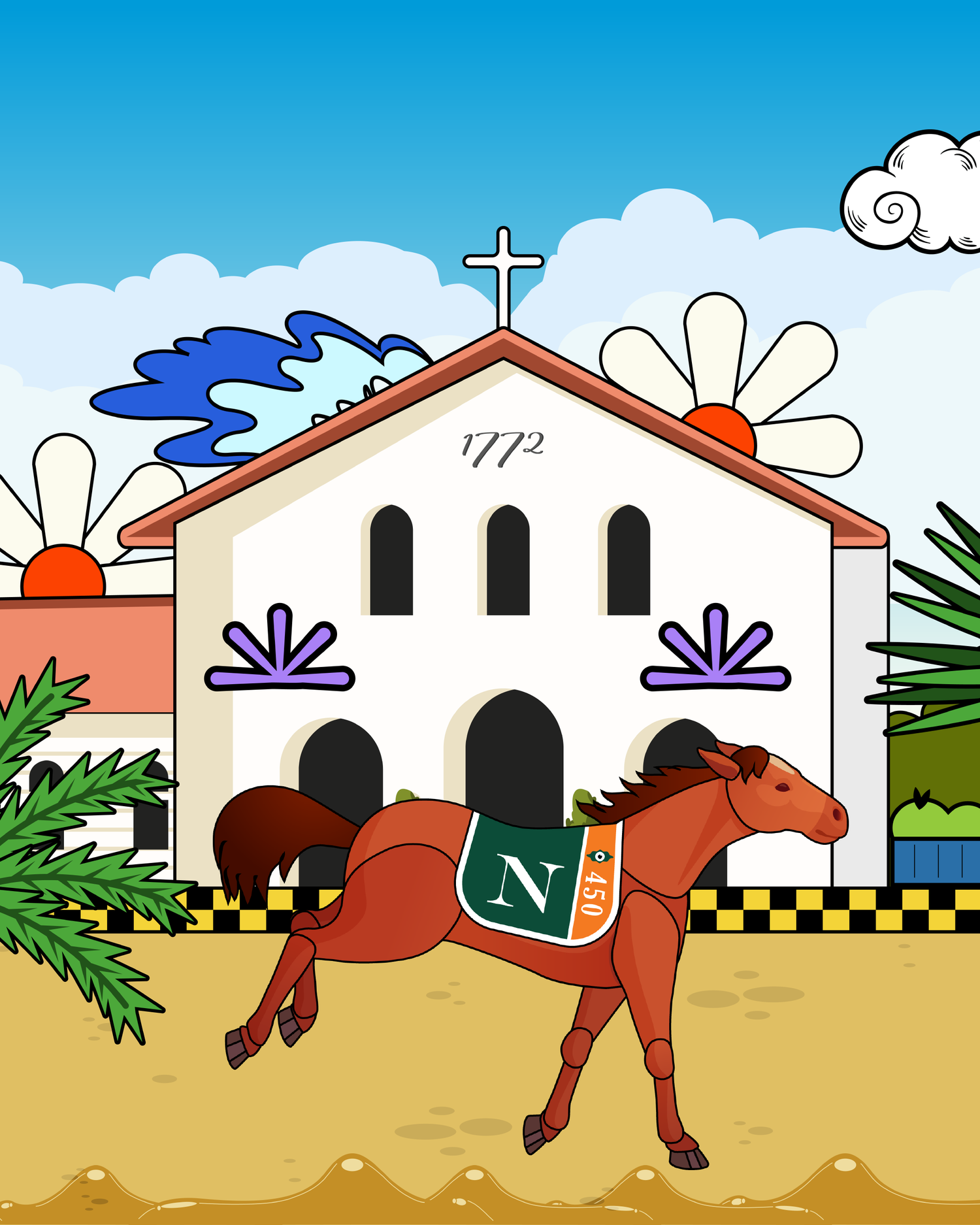 The artwork seamlessly blends the vibrant history of The Kentucky Derby with the unique architectural and cultural features of San Luis Obispo, creating a visually captivating tribute that honors both the event and the locale.