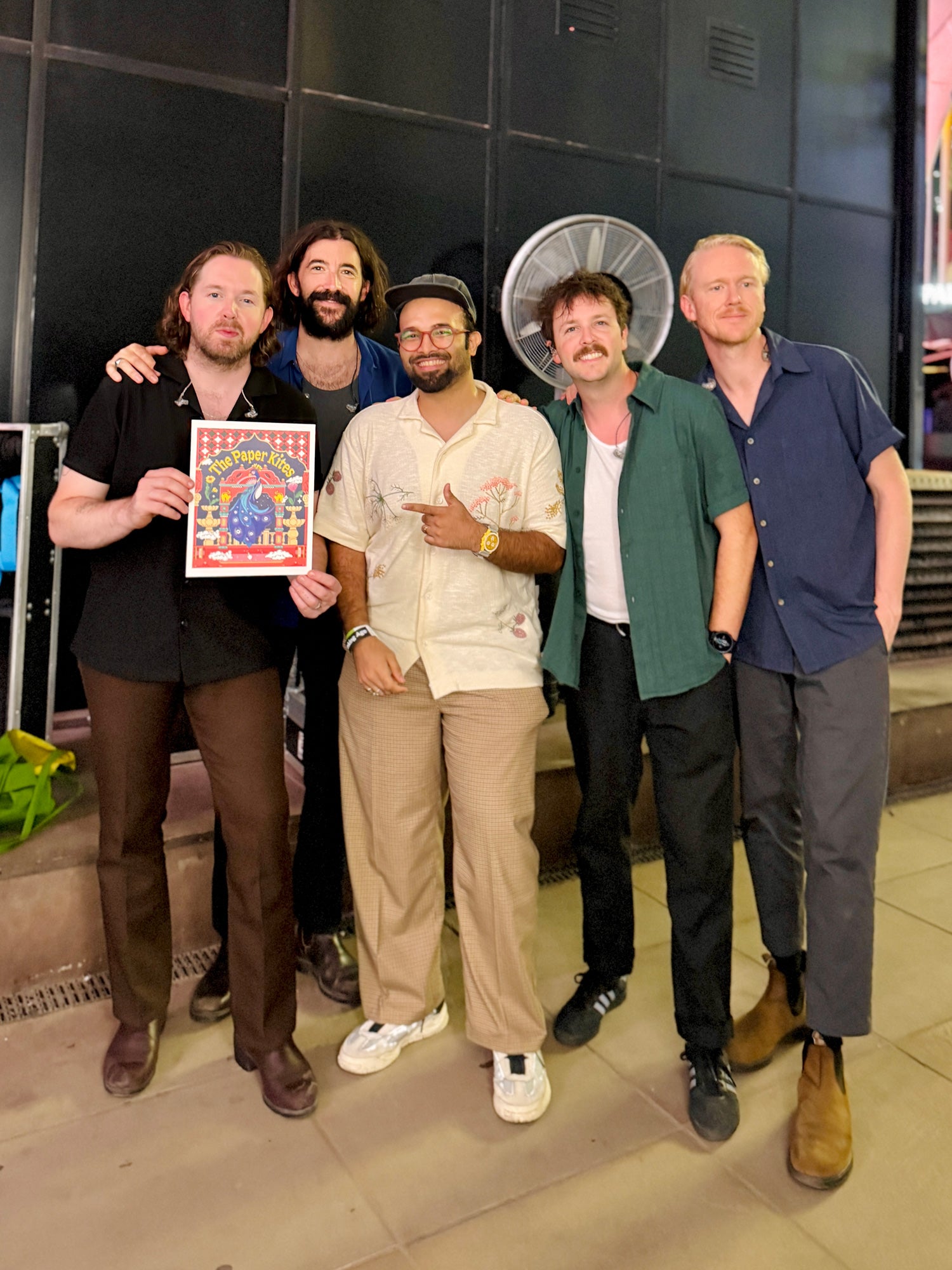The Paper Kites with Yash Pradhan backstage at the Mumbai show with the signed artwork by all the band members.